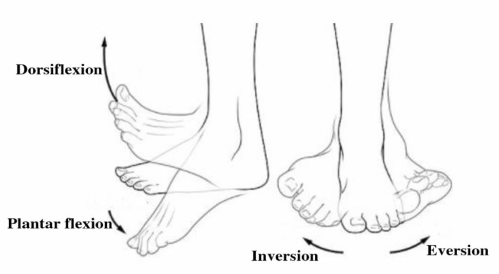The ankle joint is capable of dorsiflexion (“pointing feet”), plantarflexion (“hooking feet”) inversion(ankle rolling outwards), and eversion (ankle rolling inwards).